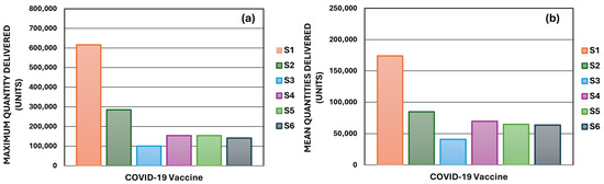 The reduction in delivered quantities enables the system to operate with fewer cargo runs, leading to a more manageable logistics operation and reducing the number of unused doses. It is important to emphasise that, in scenarios 2 to 6, delivery lots are based on real usage data obtained from local distribution centres, facilitated by sensors and blockchain (BC) technology. This trend is further confirmed in Figure 5b, which presents the mean quantities delivered.