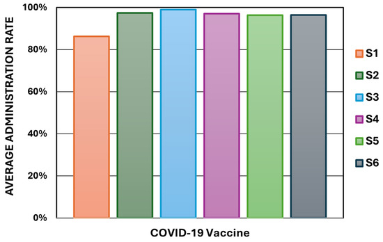 Examining the average administration rates (AAVG), the results presented in Figure 7 highlight the potential improvements that blockchain (BC) technology can introduce to the distribution system. The BC module consistently achieves higher average administration rates across all inventory management policies compared to the AS-IS scenario. Notably, the lot-for-lot method (S3) attains the highest average, despite its higher associated costs. It is also noteworthy that all stock policies, except the AS-IS model, demonstrate superior performance in terms of the number of vaccines effectively administered relative to the doses delivered. The best performance is observed in the lot-for-lot policy, which, as previously mentioned, excels in responding to demand fluctuations. By effectively mitigating demand variance in deliveries, this approach enhances the efficiency of vaccine administration. Once again, the most resilient policy—particularly in terms of maximising the number of doses effectively administered—is the lot-for-lot method, as it ensures the most effective response to demand variability.