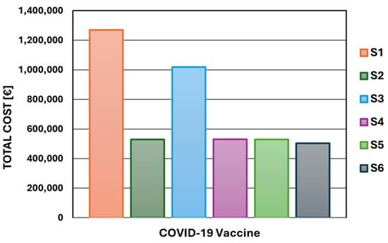 In conclusion, based on the total cost (Ctot) shown in Figure 9, it can be inferred that, while adopting daily deliveries slightly improves the administration rate, it also results in significantly higher costs. Conversely, a strategy focused on cost minimisation or balancing provides a more efficient solution, achieving better performance in both administration rates and cost control compared to the AS-IS scenario. It is evident that scenarios based on economic optimisation (S4–S6) outperform both the fixed-order period strategy and the lot-for-lot approach. Among these, the lot-for-lot method (S3) exhibits the weakest performance compared to all stock policies, except for the AS-IS scenario (S1). However, it still demonstrates an improvement in performance relative to S1. It is important to note that this KPI is highly dependent on other cost parameters and serves primarily as a summary metric from an economic perspective, providing an overarching view of cost efficiency within the analysed supply chain.
