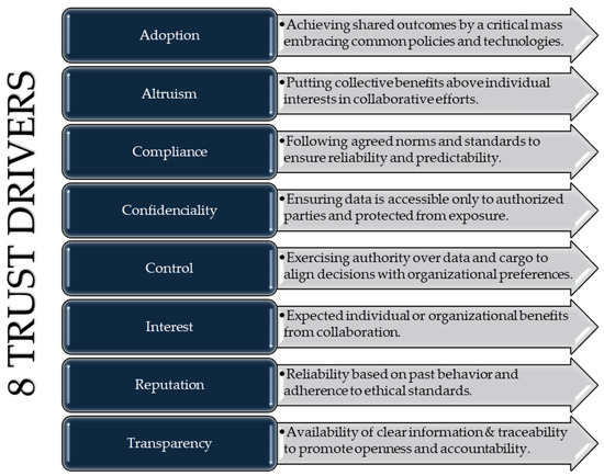 Despite great progress becoming more evident when the appropriate public–private partnerships are established to set in motion collaboration initiatives, industry stakeholders may still need convincing. Trust, or lack of it, appears to be the predominant barrier. In [9] are presented eight “trust drivers” (Figure 1) for the physical Internet, a concept for “the universal interconnection of logistics services and networks” [10].
