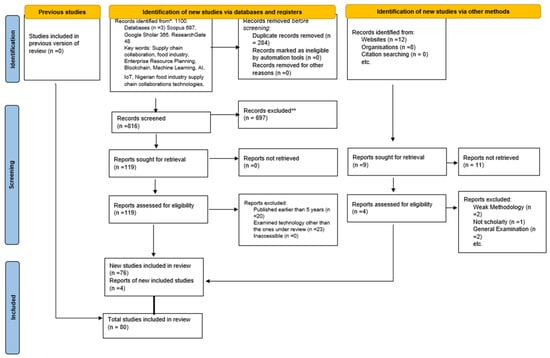 This research adopted a mixed-methods framework, integrating a systematic literature review with an empirical study to thoroughly assess the efficacy of supply chain collaboration technologies within the Nigerian food sector [67]. The systematic review adhered to the PRISMA (Preferred Reporting Items for Systematic Reviews and Meta-Analyses) framework, employing a rigorous and structured methodology to evaluate and synthesize findings from 80 pertinent academic papers and journals [68,69]. The primary study employed a closed-ended questionnaire as its data collection instrument, with subsequent analysis performed using the Statistical Package for the Social Sciences (SPSS) [70,71,72]. A systematic review was conducted to assess supply chain collaboration technologies in the food industry. The review adhered to the PRISMA 2020 guidelines to ensure a comprehensive and transparent approach. The review aimed to provide a thorough evaluation of current SCCTs in the field. A systematic review conducted on relevant studies identified a total of 1100 records from three databases: Scopus (687), Google Scholar (365), and ResearchGate (48). The search involved thorough exploration across various databases and registers to find relevant studies for further review. The search was conducted using specific keywords such as “Supply chain collaboration technologies”, “food industry”, “Enterprise Resource Planning”, “Blockchain”, “Machine Learning”, “AI”, “IoT”, and “Nigerian food industry”. After removing 284 duplicate records, 816 unique records remained to be screened. These records were screened for relevance based on their titles and abstracts, as they did not meet the criteria set for the review, resulting in the exclusion of 697 records and leaving 119 records for further consideration. Full reports of these 119 records were successfully retrieved. Upon assessing eligibility, 43 reports were excluded for reasons such as irrelevance to the review scope, unacceptable publication types, non-English language, or publication dates older than 20 years. Reports examining unrelated technologies were also excluded. Additional records were identified from websites (12) and organizations (8). The full reports of 20 additional records were sought, but only 9 were retrieved for further consideration. Out of these, 5 reports were excluded due to weak methodology, not being scholarly, or being general examinations rather than in-depth analyses. A total of 76 new studies were included in the review, with 4 reports added from additional methods. This brings the total number of studies included to 80 (see Figure 2).