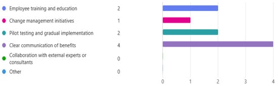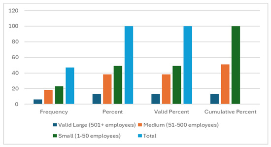 Table 4 and Figure 3 provide details on the company sizes of the respondents’ workplaces. The analysis indicated that most respondents were employed in small companies (1–50 employees), accounting for 48.9% of the total. Medium-sized companies (51–500 employees) composed 38.3%, while large companies (501+ employees) made up 12.8%. This showed that small companies were the most prevalent among respondents, followed by medium-sized and then large companies.
