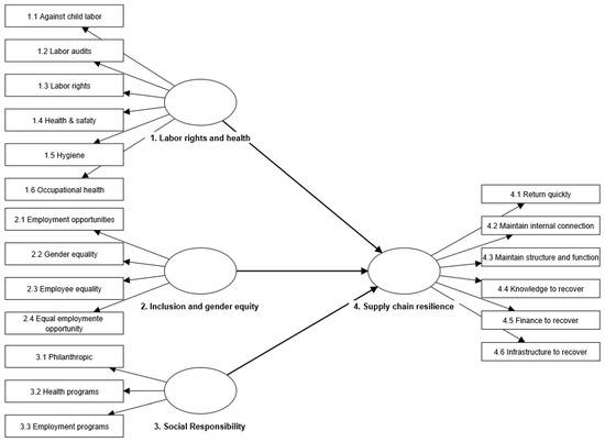 Social sustainability measures were drawn from validated approaches, constructs, and items relevant to supply chain resilience related to the COVID-19 pandemic. From the capabilities approach of our theoretical framework, aspects considered universal essentials and a necessary condition for fostering social empowerment were considered. Health was a crucial factor in the face of the health crisis [1,2,3,23,27]. Labor rights were a crucial aspect, due to the high risk of vulnerability to the economic crisis for companies, and the decrease in audits due to the pandemic [2,3,19]. Inclusion and gender equity were also fundamental aspects of social sustainability, with a high risk of vulnerability [4,25,29]. Finally, social responsibility is a factor of social sustainability that concerns the links of the supply chain with the external community [2,3,19,20]. The factorial grouping of constructs related to social sustainability in the supply chain was based on results from studies conducted in the emerging context of Latin America, specifically in Mexico [3,48]. Finally, the items were regrouped into three dimensions: labor rights and health, gender inclusion and equity, and social responsibility.