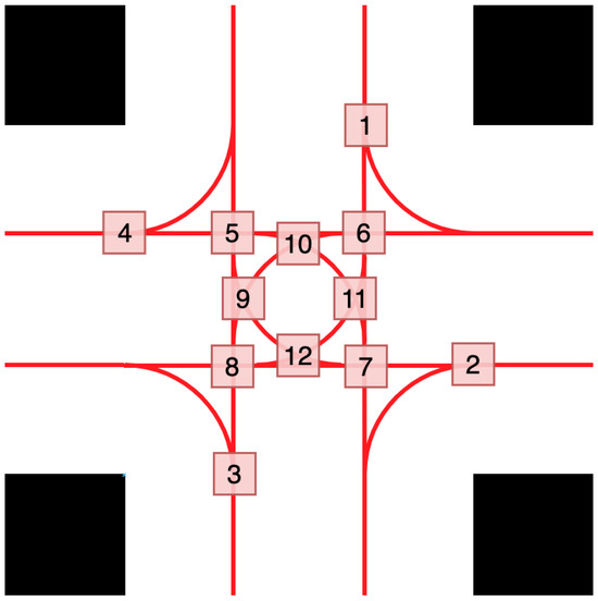 Each vehicle entering the intersection can move straight, turn left, or turn right, resulting in 12 distinct routes. These routes create 12 conflict points, where collisions may occur, as shown in Figure 1.