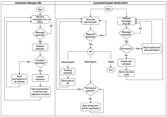 - Lombard, A.; Perronnet, F.; Abbas-Turki, A.; El Moudni, A. Decentralized management of intersections of automated guided vehicles. IFAC-PapersOnLine 2016, 49, 497–502. [Google Scholar] [CrossRef]