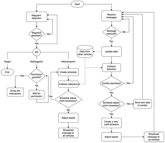 Traffic-rule-based approaches, such as those by Kato et al. [31], prevent collisions by applying rules similar to road traffic. Rules are categorized into positional (e.g., stop signs), situational (e.g., right-of-way at intersections), and safety rules. Kato’s method emphasizes optimizing system-wide behavior rather than individual vehicles. By reducing collision-prone areas and introducing traffic rules, such as a “right-before-left” rule, the likelihood of collisions can be significantly reduced. Vehicles identify intersection rules via a map and use sensors to determine priority at crossings. Such methods require centralized rules and lack cooperation possibilities. Furthermore, no prioritization is possible.