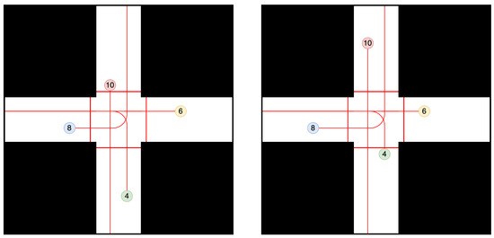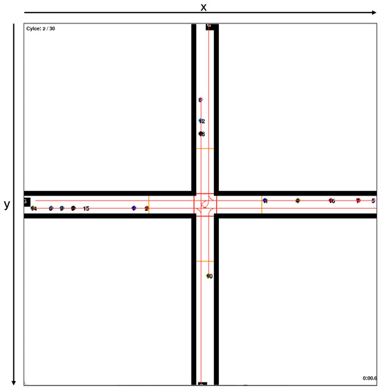 The collision avoidance problem is exemplified by a four-way omnidirectional intersection (Figure 1), with one lane per direction, enabling vehicles to pass in opposite directions without collisions. Vehicles are assumed to move freely but follow predefined routes in the intersection to simplify the control task [32]. This assumption aligns with real-world logistics centers or production environments, where structural layouts naturally restrict vehicle paths.