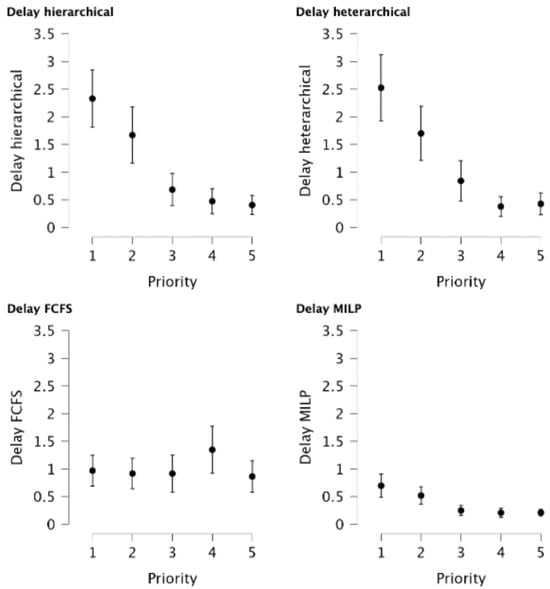 Average delays per priority for the different approaches with indication of the 95% confidence intervals from a simulation with 32 AGVs.