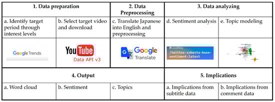 The research methodology applied in this study can be summarized as five phases (Figure 1): (1) preparing data using API to download data from YouTube, (2) preprocessing data using google translate and NLTK, (3) analyzing data involving sentiment and topic modeling, (4) obtaining the output, and (5) obtaining implications from the output.