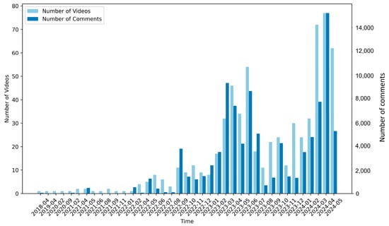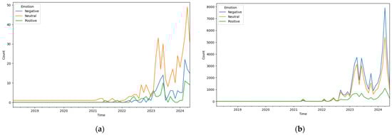 Figure 5a,b visualize the number of comments by sentiment for each time series. The “neutral” and “negative” emotions are the most common for subtitles and comments, respectively. There is a correlation between the percentage of each emotion in the number of videos and the number of comments.
