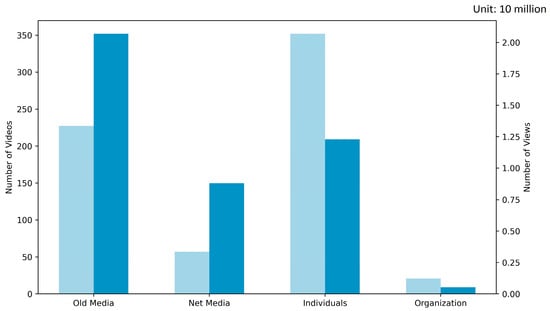 The number of videos peaked in April 2023 and April 2024 (Figure 2). The classification of contributors is dominated by individuals, followed by old media such as TV stations. However, the number of views was found to be the highest for old media (Figure 3). Comments were collected from video IDs using YouTube Data API v3. The database of video comments consists of a total of 96,749 comments. Old media had the highest number of comments, followed by individuals. The number of comments per video is 218 for old media, 399 for net media, 75 for individuals, and 14 for organizations, indicating a relatively high amount of net media.