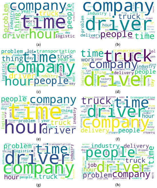 A word cloud was created from the target text data. Separate word clouds were created for subtitles and comments, and for each emotion as well. Words such as “company”, “time”, and “person” are commonly used in subtitles and comments. Other words such as “logistics”, “truck”, and “driver” are found in subtitles, and “manner”, “occupation”, and “money” are found in comments. There are no significant differences in words by emotion (Figure 4a–h).