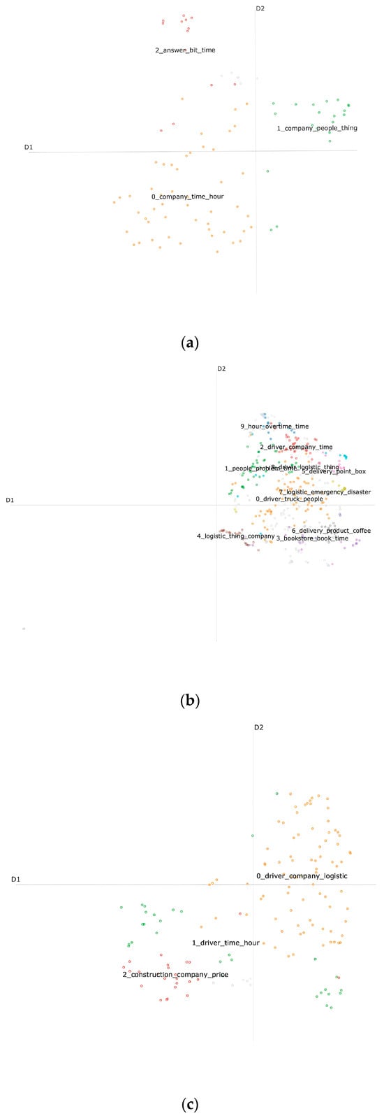 The three topics belonging to positive emotions are related to time and company. The topics belonging to neutral emotions mainly refer to objective events and situations. The main topics are those related to drivers and logistics companies, topics related to products carried, topics related to disasters, and topics related to time. The topics belonging to the negative sentiment focus mainly on challenges and problems: the first and second topics relate to drivers and delivery times, while the third is related to rates (Table 4).