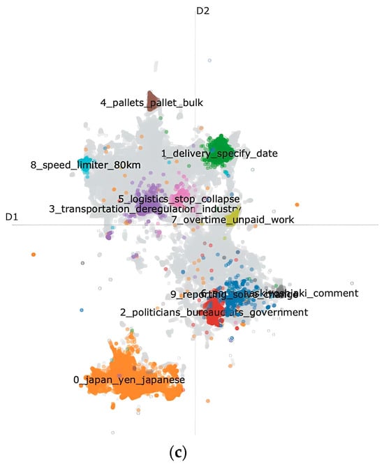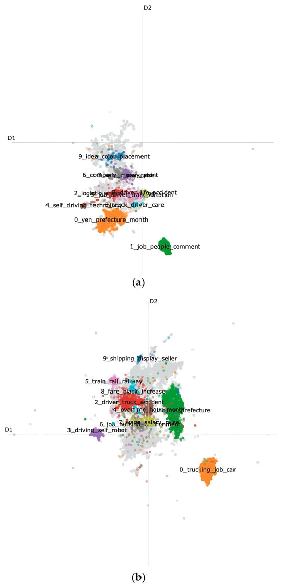 As for comments, topics belonging to positive sentiments mainly include those related to salary, such as salary and pay; those related to the driver’s job, such as job and driver; and those related to accidents and disasters, such as life and accident. Neutral sentiment topics include those related to non-truck transportation modes such as train and railway, working hours such as overtime, and new technology such as robot, in addition to those similar to positive sentiment topics. Negative topics include those related to government and public entities, such as Japan and Kishida; those related to speed, such as speed and 80 km; and those related to loading and unloading, such as pallet and bulk.