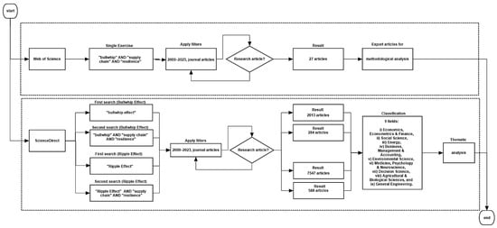 As previously mentioned, this study does not follow a systematic review protocol such as PRISMA, nor does it aim to be exhaustive. Instead, it adopts a hybrid and exploratory approach focused on identifying methodological patterns and disciplinary gaps in the intersection between the Bullwhip Effect, Ripple Effect, and supply chain resilience (SCR). The Web of Science (WoS) database was selected due to its high academic selectivity, indexing standards, and relevance for peer-reviewed, high-impact research. The search was performed using the following keyword combination: “Bullwhip Effect” AND “resilience” AND “supply chain”, covering the time window from 2000 to 2023. This narrow keyword strategy intentionally ensured thematic precision and alignment with the research objectives, even at the cost of volume. The resulting number of articles (n = 27) is not presented as a statistically representative sample of all the SCR literature but as a reflection of the limited existing academic focus on the explicit connection between these phenomena. This scarcity, in itself, is an important finding: it highlights a research gap in modeling resilience from the lens of the Bullwhip and Ripple Effects. Inclusion criteria were as follows: (i) studies published in peer-reviewed journals indexed in WoS, (ii) the explicit treatment of the Bullwhip Effect or Ripple Effect regarding supply chain resilience, and (iii) methodological clarity enabling classification. Exclusion criteria included the following: (i) inaccessible full texts, (ii) articles where resilience was only marginally mentioned, and (iii) studies unrelated to methodological modeling. All selection decisions were made manually, and full-text reading was conducted to verify thematic alignment. While modest in size, this curated dataset is analytically sufficient to detect disciplinary trends and methodological preferences, particularly in the context of nonlinear and adaptive modeling approaches such as those grounded in complex systems or AI.