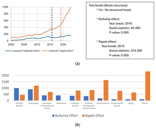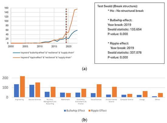 Figure 8a illustrates the production volume of scientific articles where “Bullwhip Effect”, “Ripple Effect”, “resilience”, and “supply chain” are used as keywords, showing remarkable exponential growth in this interdisciplinary area. As indicated by the Swald test, which found a structural break in 2019, which served as a major catalyst for this surge in research output for Bullwhip and Ripple Effects: the year 2019 witnessed several significant economic and logistical events globally (critical values were determined based on the chi-square distribution at conventional significance levels (1%, 5%, and 10%); the reported