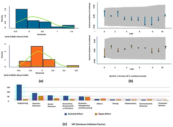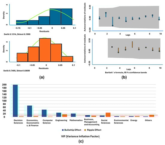 Figure 8b highlights that the highest-ranked academic areas in the collected data include Engineering and Decision Science alongside Business, Mathematics, Economics, Social Sciences, Environmental, Computer, Energy, and others. This suggests that applied Engineering Sciences play a critical role in the study of the Bullwhip Effect in its general scope. For the quantitative analysis, a series of tests were conducted on the collected time series to ensure their statistical robustness, checking for probabilistic distribution, multicollinearity, autocorrelation, and stationarity. High multicollinearity was found in the variables, as confirmed by the Variance Inflation Factor test (