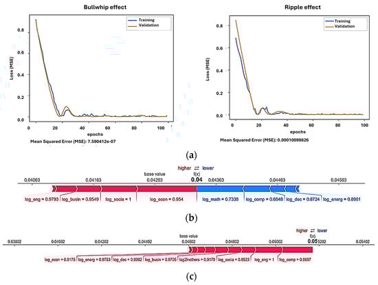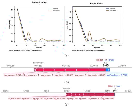 Figure 10b is a SHAP (Shapley Additive Explanations) force plot, which reveals the individual feature contributions to a particular average output. SHAP (Shapley Additive Explanations) was applied to interpret variable importance in the LSTM neural network model used for bibliometric trend analysis. This approach was chosen due to its ability to provide transparent, feature-level contributions in complex, nonlinear models. To ensure robustness, SHAP results were compared with alternative feature importance methods (e.g., permutation importance) and exhibited consistent patterns, reinforcing its validity for this context. Given SHAP’s widespread use in deep learning explainability, its application here is methodologically justified. Here, for the Bullwhip Effect, study fields like Economics and Social are pushing the prediction value higher (shown in red), while variables such as Mathematics and Computation are pushing it lower (shown in blue). This demonstrates that certain variables like Economics and Social Sciences have a more significant positive effect, indicating a strong correlation with the target of the Bullwhip Effect. Conversely, the technical fields such as Mathematics, Computation, Decision, and Energy Sciences contribute less, or even negatively, suggesting that their influence on the model is less direct in this scenario. For the case of the Ripple Effect,