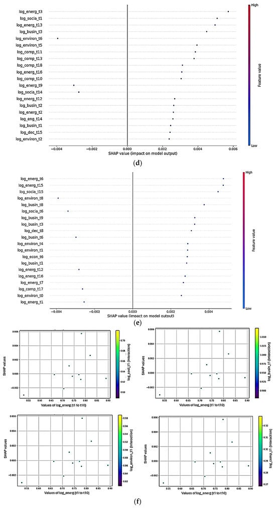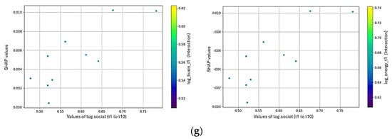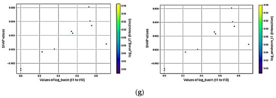 Figure 10g shows the Ripple Effect’s ones (Business, Energy, Environment). For the Bullwhip Effect results, the Energy variable demonstrates a nonlinear relationship with SHAP values; additionally, the variable Energy has an important influence from the Business and Environment variables on its higher values. For the case of the Ripple Effect,