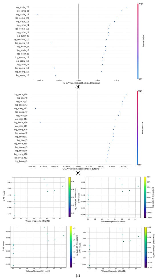 Figure 10f, the SHAP dependency plot shows how the Energy interacts with the model’s predictions and with the rest of the Bullwhip Effect’s most important variables (Social, Business, Environment, Computation Sciences), and