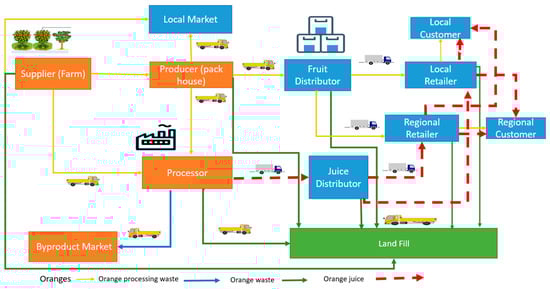 The supply chain originates from farms (suppliers). Fifteen-year-old mature Valencia orange trees are cultivated organically. Fruits from the farm are sold to the processor, with non-conforming-quality fruits being directed to local markets. The processor specializes in producing organic orange juice (not from concentrate). Throughout the season, oranges are delivered daily from suppliers for processing, after which the organic orange juice is transported to juice distributors in Egypt. These distributors supply orange juice to local and regional retailers, though they are not included in the case study. Nevertheless, they are represented as a part of the supply chain. Citrus processing waste from fruit processing is sold to byproduct producers, represented by the byproduct market. The supply chain comprises three suppliers, one processor, and two juice distributors.