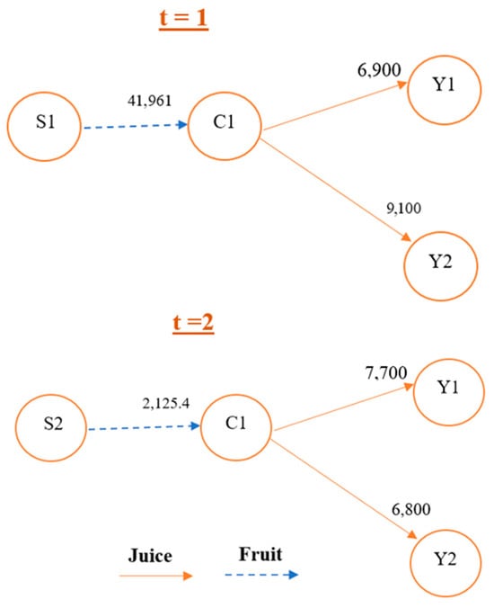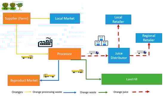 An Egyptian organic orange juice supply chain of a company is utilized as a real case study to validate the proposed model. This company supplies juice to local and regional customers. The company’s supply chain is depicted in Figure 2. Data are collected through interviews with company managers at the farm and processing facility.