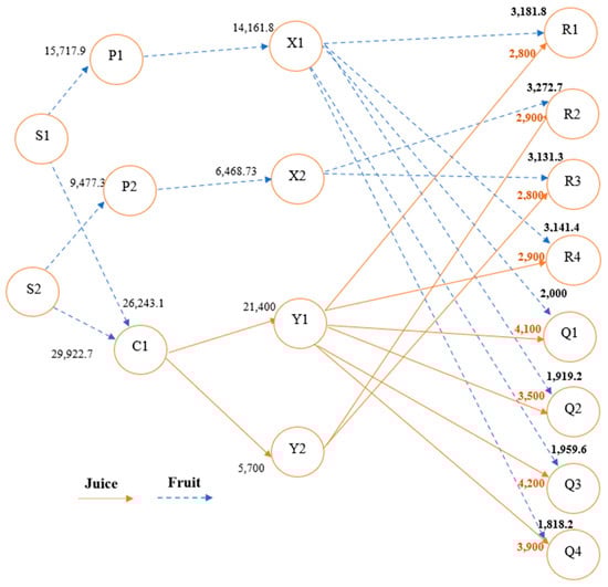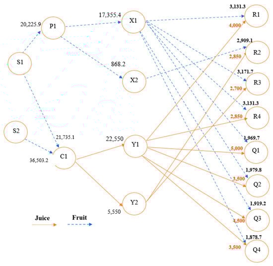 The model is solved using Gurobi Optimizer 10.0.2 on a laptop with Intel(R) Core (TM) i7-6500U CPU @ 2.50GHz and 16 GB RAM. The model results for the two time periods are presented in Figure 3 and Figure 4. These figures illustrate the optimum citrus supply chain (CSC) network and the transported quantities among supply chain echelons. The blue and orange arrows show the flow of citrus fruit and juice, respectively. The results indicate that only two suppliers (S1 and S2) are selected as they provide the lowest costs, and one processor (C1) is utilized due to its sufficient processing capacity. Table 7 and Table 8 illustrate the quantities sent to landfills, production, and stored quantities, and the quantities transported to local markets and byproduct markets. According to the results, the complete supply chain profit is around EGP 4.48 million over the two weeks. Figure 5 displays the profit of each echelon in the supply chain, highlighting each echelon’s contribution to the overall profit.