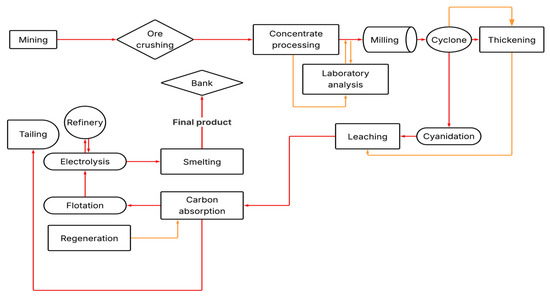 Figure 1. According to the mining employees, it begins with mining companies extracting gold ore from the mining site and transporting it to a processing factory for thorough cleaning. The gold ore undergoes its primary processing stages at the processing facility, including crushing, washing, milling, and concentration. Smaller particles then undergo cyanidation, in which gold is leached from the ore, dissolved, and adsorbed onto activated carbon. After desorption, the gold is present in a gold-saturated solution, setting the stage for subsequent processing phases. Following refinement, the product undergoes electrolysis, extraction, and fire treatment, resulting in a gold–silver alloy with a minimum gold content of 70%. After further treatment, this alloy achieves a purity level of 99.99% gold. The refined gold is then presented to the National Bank for potential purchase in compliance with legislative mandates. If the National Bank chooses to buy the gold, it is securely stored in its facilities. The National Bank may sell the gold to foreign counterparts depending on market demand. If the National Bank declines the purchase, mining companies can offer the gold to international entities abroad. This detailed overview provides insights into the key components of the gold-mining supply chain, emphasizing the importance of eco-conscious practices and innovative methodologies in enhancing the sustainability of gold-mining operations.