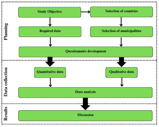 As presented in Figure 1, after defining the general objective of the study, the subsequent steps involved determining the countries and municipalities to be considered. In this case, in addition to the similarities between the two countries (language, culture, among others), a small number of studies addressing home health services in each country were identified. The cities were selected based on the recommendation of the national manager of home health in each country, considering criteria such as productivity, workload, and service quality. Consequently, the necessary data to achieve the proposed objective were defined. The type of questionnaire and the questions were determined considering indicators related to the general characterization of services, required resources, planning, materials, and information recording. After obtaining favorable opinions from the ethics committees, the scheduling process began with the managers of each team and municipality. The application was conducted in person, and both quantitative and qualitative data were collected. These data were subsequently inputted and organized in Google Sheets and subsequently analyzed. The results are presented and discussed in this study.
