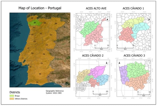 In the Portuguese case, only ACES under the responsibility of the Northern Regional Health Administration (ARS Norte) were selected. This region consists of a total of 24 ACES, 87 ECCI, and two support warehouses. The Maia and Vila Real warehouses are responsible for supplying all the necessary materials for the execution of HHC in the jurisdictional area of the Northern Regional Health Administration (ARS Norte). Requests for materials and consumables are typically made monthly through a logistics computer system and are delivered by the warehouse team on a designated date. In cases of urgency, extraordinary requests are usually accepted to prevent care delivery failures due to a lack of materials. The ECCI in this region typically has a total of 20 vacancies for user registration and an average occupancy rate of 70.1% []. For the present study, 4 ACES were selected: Cávado I, Cávado II, Cávado III, and Alto Ave (Figure 2).