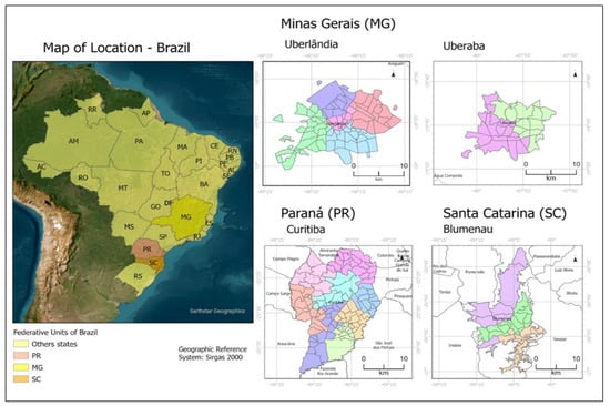 However, there are regions with high numbers of people in this age group who do not have teams, such as in some cities in the interior of the state of São Paulo, in the state of Pará, in the border region between Argentina and Uruguay, and in the capitals of the states of Espírito Santo and Roraima (the only states not covered by the program). In the Brazilian context, four different cities (Blumenau, Curitiba, Uberaba, and Uberlândia) were selected, comprising a total of 18 EMAD teams, as depicted in the map (Figure 3).