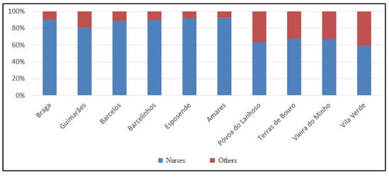 However, the average percentage of hours worked by nurses on the analyzed teams in Brazil (74%) was lower than that in the Portuguese case (79%). This is because the workload of other professionals (e.g., physiotherapists and doctors) is greater in the Brazilian context. Additionally, EMAD teams in Brazil include other professionals, such as nursing technicians and physiotherapists. In contrast to Portuguese ECCIs, rehabilitation care in Brazil is typically provided by physiotherapists. Furthermore, in addition to participating in multidisciplinary visits (such as in Portugal), physicians also perform some less complex procedures.
