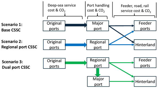 Figure 2. Three container shipping supply chain (CSSC) scenarios.