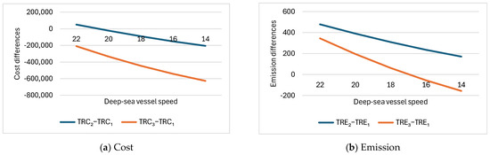 The deep-sea service in Scenario 3 differs from that in Scenario 1 by adding Liverpool to the route. This change not only increases the total sailing distance but also adds additional port call time (e.g., for vessel mooring and casting off at Liverpool). We assume the additional port call time to be 8 h [4]. Consequently, the deep-sea vessel must operate at a higher sailing speed to compensate for the extra distance and time, in order to maintain the same overall round-trip duration as in Scenario 1. Based on this, the sailing speeds in Scenario 3 can be determined as follows:
