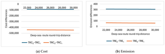 In this subsection, the marine-fuel emission factor Km varies from 1.2, 1.0, 0.8, to 0.6 gCO2/g, representing different levels of carbon emissions from low-carbon fuels. Other parameters are fixed as follows: sd1 = 18, dd1 = 26,000, h = 2000, Cfuel = 1000, W1W2 = 15, modalSplit2 = 0.1. Table 2 gives the performance differences between Scenarios 2 and 3 compared to Scenario 1 for individual cost components, total relevant cost, individual CO2 emission components, and total relevant CO2 emissions. The total emission differences (i.e., TRE2TRE1, TRE3TRE1) are visualized in Figure 6.