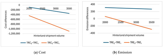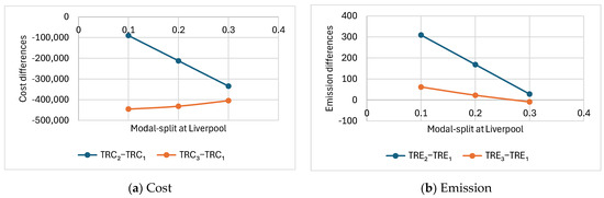 In this subsection, the rail modal rate modalSplit2 varies from 0.1, 0.2, to 0.3. Low level 0.1 represents the current situation at Liverpool, while high level 0.3 represents the current situation at Southampton. Other parameters are fixed as follows: sd1 = 18, dd1 = 26,000, h = 2000, Km = 1.2, Cfuel = 1000, W1W2 = 15. Table 8 gives the performance differences between Scenarios 2 and 3 compared to Scenario 1 for individual cost components, total relevant cost, individual CO2 emission components, and total relevant CO2 emissions. The total cost differences (i.e., TRC2TRC1, TRC3TRC1) are visualized in Figure 9a, and the total emission differences (i.e., TRE2TRE1, TRE3TRE1) are shown in Figure 9b.