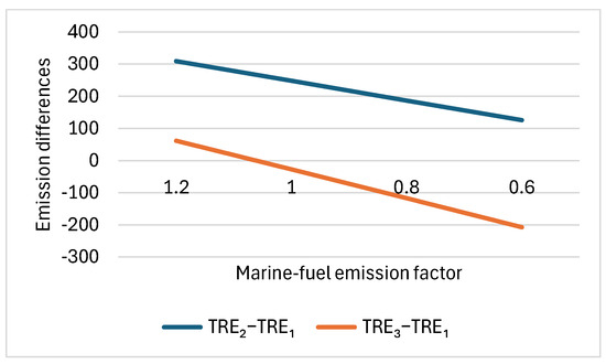 From Table 5, it can be observed that as the marine-fuel emission factor decreases, the cost differences between the rerouting scenarios and the base scenario remain unchanged; Scenarios 2 and 3 are consistently more economically favorable than the base scenario across all cases. From an emissions perspective, the emission difference decreases as the marine-fuel emission factor decreases (Table 5 and Figure 6). This indicates that a lower marine fuel emission factor would favor rerouting to regional ports from an emissions perspective. The base scenario outperforms Scenario 2 in all cases. In contrast, Scenario 3 becomes environmentally preferable to the base scenario when the emission factor drops to 1.0 or below.