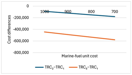 In this subsection, the marine-fuel unit cost Cfuel varies from 1000, 900, 800, to 700 USD/ton. Lower unit costs represent that low-carbon alternative fuels might become cheaper as they scale up in the future. Other parameters are fixed as follows: sd1 = 18, dd1 = 26,000, h = 2000, Km = 1.2, W1W2 = 15, modalSplit2 = 0.1. Table 6 gives the performance differences between Scenarios 2 and 3 compared to Scenario 1 for individual cost components, total relevant cost, individual CO2 emission components, and total relevant CO2 emissions. The total cost differences (i.e., TRC2TRC1, TRC3TRC1) are visualized in Figure 7.