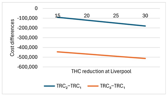 Figure 8. Total relevant cost differences between Scenarios 2 and 3 compared to Scenario 1 with varying THC reduction at Liverpool.