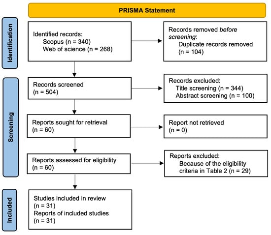 The initial search yielded a total of 608 results: 340 from Scopus and 268 from Web of Science. All records were exported and imported into a literature management tool designed for systematic reviews. This tool enabled efficient handling of duplicates and facilitated the multi-stage screening process using customizable inclusion and exclusion filters [].