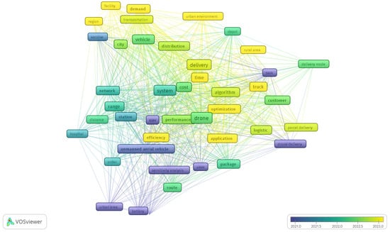 The first part of the bibliometric analysis is focused on the most relevant and related topics of the reviewed publications. The following Figure 2 is a network visualization map generated from VOSviewer version 1.6.20 software and depicts the average timeline showing when the various key points appeared in a weighted chronological order across all connecting papers.