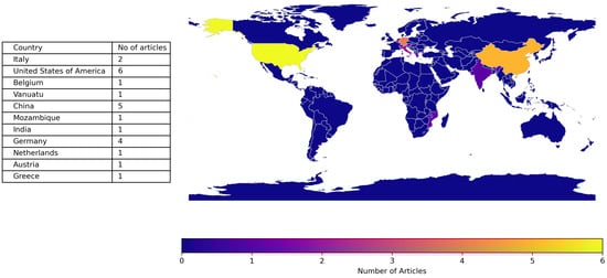 The subsequent section of the analysis highlights the geographic distribution of the studies included in this review (see Figure 3). A clear pattern emerges, indicating that research in drone logistics predominantly focuses on highly developed countries such as Belgium, Germany, Italy, and the United States; settings characterized by advanced technical infrastructure, including laboratories and production facilities. Conversely, a notable proportion of studies also examine less developed regions, including Vanuatu and Mozambique. While the appeal of well-established technological environments is self-evident, factors such as minimal regulatory barriers, underutilied airspace, and limited ground infrastructure in lower-income settings present unique opportunities and motivations for research in these context.