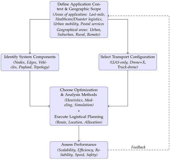 The remainder of this paper is structured as follows: Section 2 describes the systematic review methodology, including the search strategy, inclusion and exclusion criteria, and classification procedure. Section 3 presents the descriptive and thematic results of the review. Section 4 introduces a conceptual framework for planning drone logistics networks based on the identified categories. Section 5 provides a discussion of key findings, challenges, and research directions. Finally, Section 6 concludes the study with a summary of contributions and recommendations for future work.