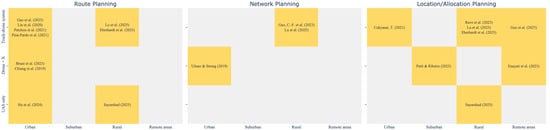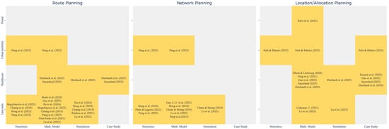 The first dimension examined in the review is the type of logistical planning problem addressed by each study, as summarized in Table 4. This analysis considers whether the study explicitly engages with a logistical planning task, and if so, classifies it into one or more of four commonly recognized categories in the logistics literature: