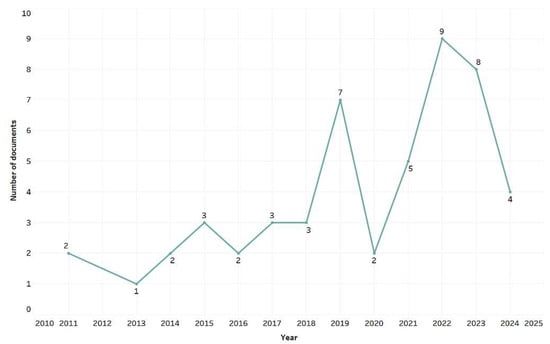 We consider both quantitative and qualitative studies. We did not include a filter in terms of timeframe, but following the study selection stage, we retained only articles published between 2011 and 2024. Although humanitarian logistics has been a subject of study for many years, it is only since 2011 that the integration of green and sustainability concepts in humanitarian supply chains has attracted significant attention [,]. The studies published since have emphasized environmental concerns, decarbonization efforts, and the minimization of environmental impacts in humanitarian operations.