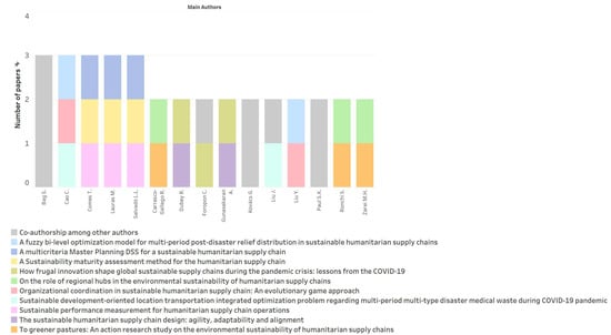 Figure 3 presents the publication counts of key authors in the field, making it easy to identify prolific contributors and their collaborative networks. Authors sharing a color in the chart are co-authors; a gray bar indicates co-authorship with researchers not in the primary list. For instance, Comes, Lauras, and Salvado co-authored three papers, represented by yellow, blue, and pink bars.