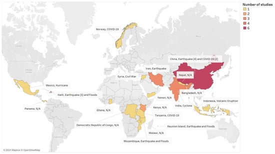 Many of the articles reviewed incorporated case studies simulating real-life disasters and crises to reflect the nature and purpose of humanitarian logistics and test theory in realistic settings. Among the 51 papers reviewed, we identified 30 case studies across 19 countries, covering about 59% of the total sample. Figure 4 shows a world map color-coded according to the number of case studies per country and the type of crisis addressed. China and Haiti are the locations studied most frequently, and natural disasters (particularly earthquakes) have been studied more than other types of crises. Importantly, the global impact of the COVID-19 pandemic has meant that it has been extensively researched.