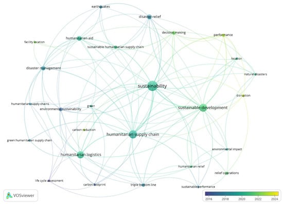 Finally, we conducted a VOSViewer 1.6. 20 analysis to identify the main topic clusters based on the most frequently cited keywords in titles and abstracts, as illustrated in Figure 5. Three primary clusters emerged from this analysis. Cluster 1 (carbon footprint, carbon reduction, environmental sustainability, green supply chain, humanitarian aid, life cycle assessment, decision-making, facility location, disaster management) highlights the importance of green initiatives in decision-making processes in humanitarian supply chains. The analysis also indicates that sustainability, environmental impact, and reducing the carbon emissions of humanitarian logistics have only recently attracted attention. Nevertheless, as shown graphically, these topics remain underexplored, presenting a valuable opportunity for further research.