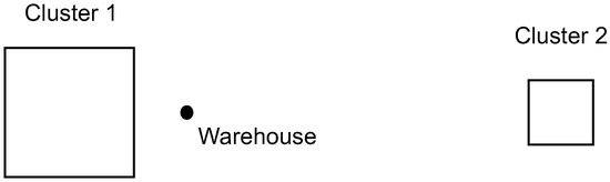 Graphical illustration of the problem setting: Customers are distributed on the large high-density Cluster 1, closer to the warehouse, and the low-density Cluster 2, which is less convenient to serve.