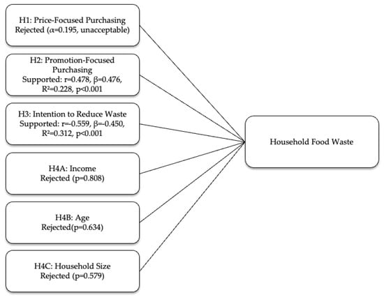 Regarding Hypothesis H4, which explored whether socio-demographic characteristics—specifically household size, income, and age—are associated with household food waste, the analysis did not yield statistically significant results. The p-values for household size (p = 0.579), annual income (p = 0.808), and age (p = 0.634) were all well above the 0.05 threshold, indicating that no meaningful correlations were detected in the sample. This outcome is somewhat unexpected, given that numerous previous studies have identified significant associations between these variables and food waste levels [,,,]. Several possible explanations may account for this discrepancy. First, the sample was skewed toward younger respondents, particularly those aged 20–29, which may have limited the variability required to observe age-related trends. Second, the income distribution in the sample was relatively even, potentially masking the economic constraints or excesses typically associated with waste behaviour. Lastly, cultural or regional dynamics specific to Attica may moderate the influence of these socio-demographic variables, reducing their statistical relevance. Despite the lack of significance, these findings raise important questions about the generalisability of demographic predictors across different contexts and suggest a need for more nuanced investigation into how socio-economic factors interact with food waste behaviours. Therefore, Hypothesis H4 is rejected. The statistical results are summarised in Table 3. A graphical summary of the hypothesis testing results, including directions of the relationships and statistical values (r, β, R2, p-values), is presented in Figure 2.